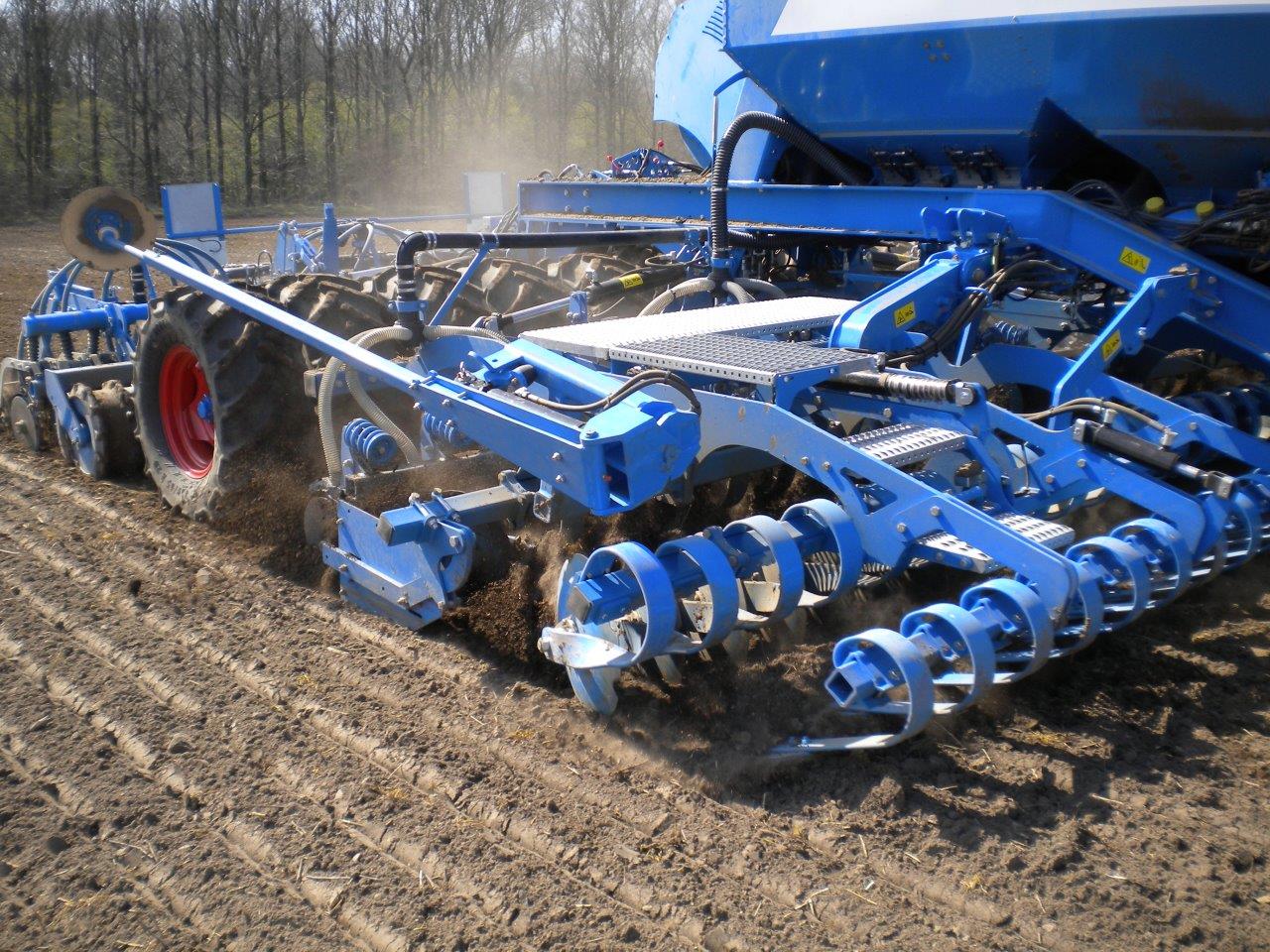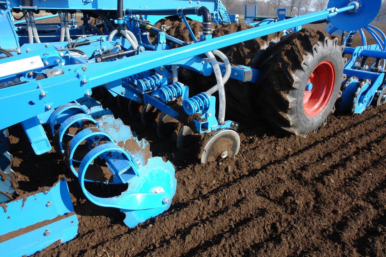 - Для передпосівної підготовки використовуються секції короткої дискової борони Heliodor, після якої встановлено сошники діаметром 400 мм для внесення добрив у міжряддя. Притиск сошників регулюється в межах до 150 кг. Після цього шинний коток великого діаметру забезпечує оптимальне ущільнення посівного горизонту. У якості унікального оснащення LEMKEN пропонує інтегрований трапецієвидний коток з системою розподілу тиску, який робить попереднє ущільнення точно по траєкторії руху насіннєвого сошника